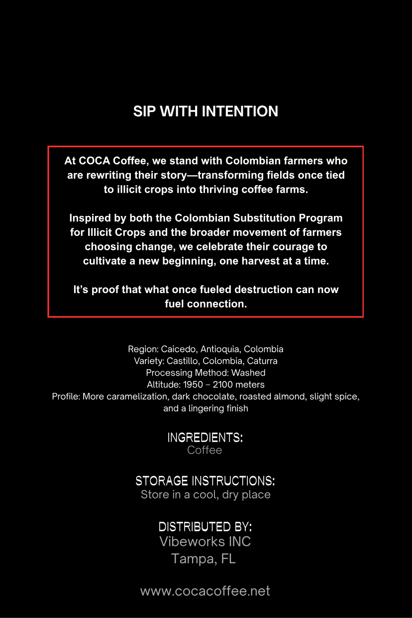 Coca Coffee is more than a name—it’s a transformation. Each bean comes from Colombia’s old coca fields, once symbols of struggle, now fertile ground for redemption. Here, former coca farmers have chosen a new path, replacing illegal crops with rows of vibrant coffee trees that stand for hope, community, and a better future. Every cup tells that story.