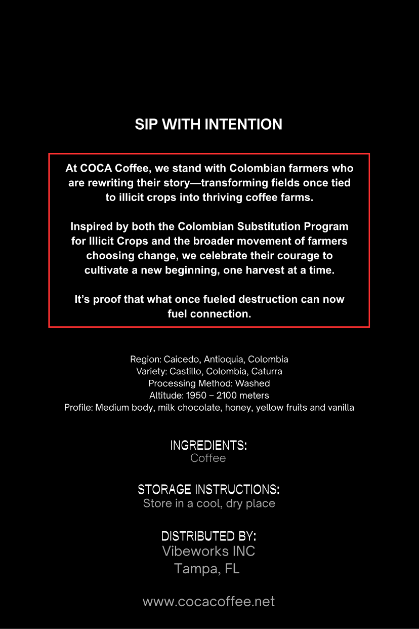 Every bag tells a story of transformation — farmers in Caicedo turning from coca to coffee, building a legacy rooted in hope and hard work.