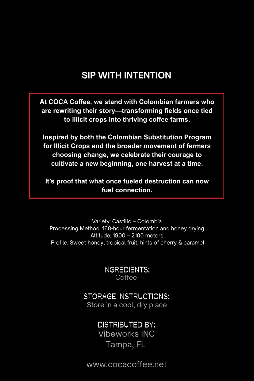 Coca Coffee is more than a name—it’s a transformation. Each bean comes from Colombia’s old coca fields, once symbols of struggle, now fertile ground for redemption. Here, former coca farmers have chosen a new path, replacing illegal crops with rows of vibrant coffee trees that stand for hope, community, and a better future. Every cup tells that story.